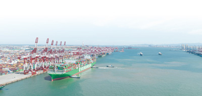 山东港口青岛港前湾港区正在靠泊世界最大的2.4万标箱的集装箱船舶。 |