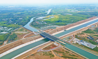 近日,由中铁四局参建的引江济淮淠河总干渠渡槽通航。据了解,淠河总干渠比引江济淮航道高出30多米,通过架设渡槽,淠河水从引江济淮运河“跨过”,形成一座河上有河、可通水行船的“水桥”。淠河总干渠渡槽总长350米,其中钢渡槽全长246米。图为日前拍摄的位于安徽省肥西县高店镇的引江济淮淠河总干渠钢结构渡槽工程。