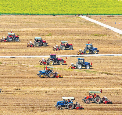 近日,湖北省孝感市云梦县的农民抢抓农时,积极投入秋耕秋播中。图为9月26日,在云梦县盛砦村的农田里,大型农机正在耕种。