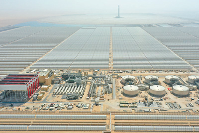 在阿联酋迪拜马克图姆太阳能公园内,由上海电气总承包的700兆瓦光热和250兆瓦光伏太阳能电站项目建设稳步推进。该项目是全球装机容量最大、投资规模最大、熔盐罐储热量最大的光热光伏综合项目之一,完全投产后,将为当地32万户家庭提供清洁电力,每年减少约160万吨碳排放。图为光热光伏综合太阳能电站远景。