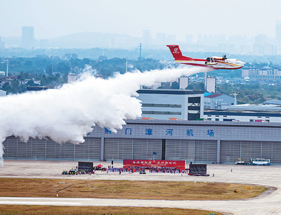 图为27日,AG600M灭火机正在进行12吨投汲水试验。 |