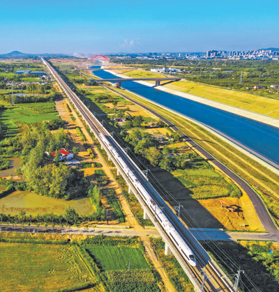 安徽省合肥市庐江县引江济淮工程柯坦段,飞驰的高铁与引江济淮工程交相辉映,景色如画。 李红兵摄(影像中国)