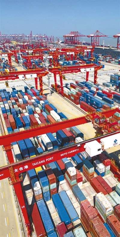 日前,江苏省太仓港集装箱码头,进出港口装卸作业的集装箱货轮繁忙有序。国庆假期,太仓港集装箱码头6000多名码头作业人员坚守港口生产一线,确保码头吞吐作业平稳运行。