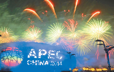推动构建面向未来的亚太伙伴关系,谱写亚太发展新篇章。2014年11月11日,亚太经合组织第二十二次领导人非正式会议在北京怀柔雁栖湖国际会议中心举行,国家主席习近平主持会议。图为在北京奥林匹克公园举行的亚太经合组织第二十二次领导人非正式会议焰火表演。 |