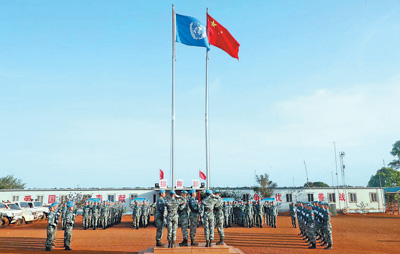 积极履行大国责任义务,用实际行动兑现维护世界和平的郑重承诺。2015年9月,国家主席习近平在纽约联合国总部出席联合国维和峰会时宣布一系列支持联合国维和行动的重大举措。图为中国在南苏丹执行维和任务的官兵举行升旗仪式。 |