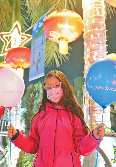 2022年1月24日,埃及开罗地标性建筑开罗塔上演灯光秀,表达对北京2022年冬奥会的祝愿和支持。图为一名女孩在灯光秀活动中留影。 |