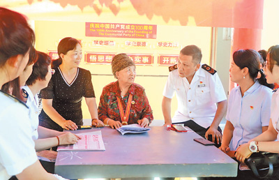在全党开展党史学习教育,掀起学史明理、学史增信、学史崇德、学史力行的热潮。图为“七一勋章”获得者王兰花到社区开展宣讲活动。 |