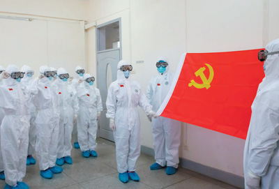 面对突如其来的新冠肺炎疫情,湖北省18万个基层党组织、387万名党员冲锋在前,58万名党员干部下沉社区,组建各类党员突击队、党员抢险队、党员服务队7万多个,在方舱医院等一线建立临时党组织1.9万个,在抗疫一线发展1935名优秀分子入党。图为中部战区总医院进行新党员火线入党宣誓和老党员重温入党誓词仪式。 |
