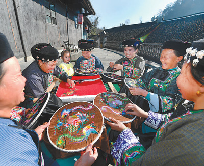 因地制宜发展种植、苗绣、乡村旅游等特色产业,实现从“输血”到“造血”的根本转变,走出了一条产业兴、设施优、品位高、保障好、生活美的脱贫致富之路。图为湖南省花垣县十八洞村苗绣特产农民专业合作社的绣娘在生产苗绣产品。 |