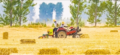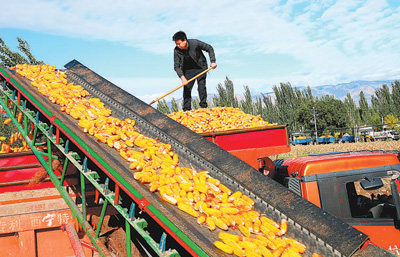 甘肃省张掖市甘州区上秦镇东王堡村,村民正将丰收的玉米交售制种企业。 |