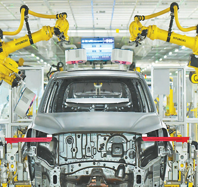 创新发展动能增强。图为河北省沧州市一家汽车工厂,智能机械臂在生产线上作业。 |
