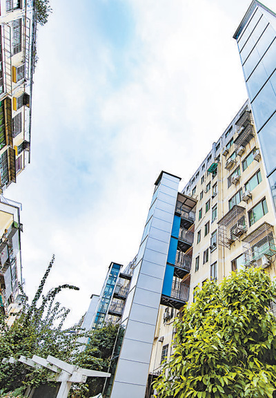 共享发展持续加强。图为江西省赣州市章贡区的老旧小区江湾花园小区,居民楼经过改造后加装了电梯。 |