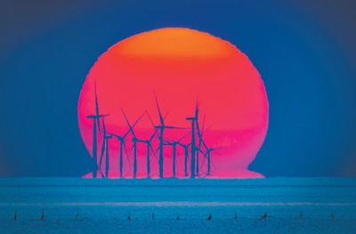 日出时刻,江苏省盐城市黄海湿地上的风力发电场。 |