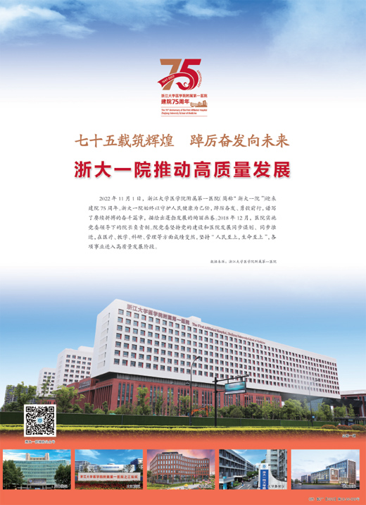 2022年11月1日,浙江大学医学院附属第一医院(简称“浙大一院”)迎来建院75周年。浙大一院始终以守护人民健康为己任,踔厉奋发、勇毅前行,谱写了赓续拼搏的奋斗篇章,描绘出蓬勃发展的绚丽画卷。2018年12月,医院实施党委领导下的院长负责制。院党委坚持党的建设和医院发展同步谋划、同步推进,在医疗、教学、科研、管理等方面成绩斐然,坚持“人民至上,生命至上”,各项事业进入高质量发展阶段。