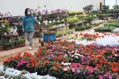 陕西省西安市因地制宜,建设多种类型的都市现代农业项目,积极探索粮食生产、稳产保供与旅游休闲融合发展,全面推进乡村振兴。图为工作人员在长安区秦岭花世界农业景区的花卉温棚里工作。