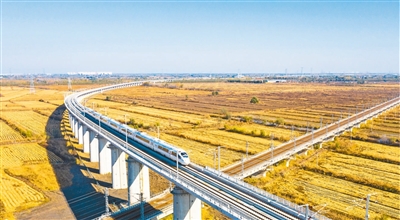 交通一体化是推进京津冀协同发展的先行领域,党的十八大以来,助力三地互联互通的交通项目捷报频传,“轨道上的京津冀”初步建成。图为动车组列车行驶在京滨城际铁路宝坻至北辰段。