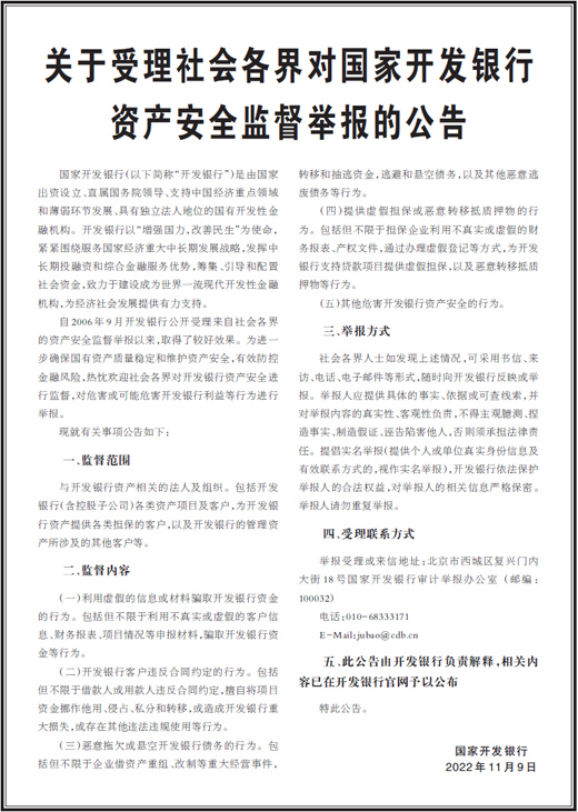 自2006年9月开发银行公开受理来自社会各界的资产安全监督举报以来,取得了较好效果。为进一步确保国有资产质量稳定和维护资产安全,有效防控金融风险,热忱欢迎社会各界对开发银行资产安全进行监督,对危害或可能危害开发银行利益等行为进行举报。