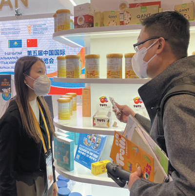 11月7日,食品与农产品展区,哈萨克斯坦展台工作人员向零售商介绍天然果脯。 |