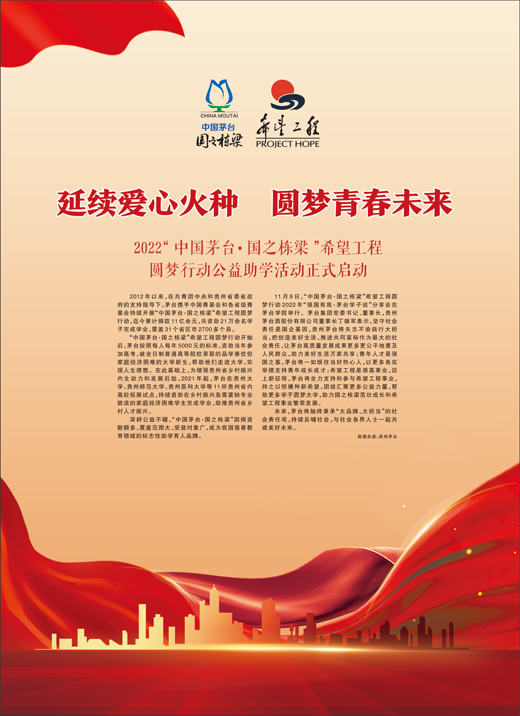 2012年以来,在共青团中央和贵州省委省政府的支持指导下,茅台携手中国青基会和各省级青基会持续开展“中国茅台·国之栋梁”希望工程圆梦行动,迄今累计捐款11亿余元,共资助21万余名学子完成学业,覆盖31个省区市2700多个县。