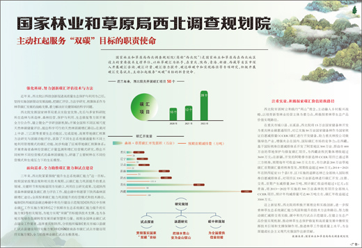 国家林业和草原局西北调查规划院(简称“西北院”)是国家林业和草原局在西北地区设立的重要技术支撑单位,以林草碳汇为抓手,在重庆、陕西、青海、新疆、西藏等省区市深入开展碳汇咨询、碳汇计量、碳汇潜力提升、碳达峰碳中和实现路径等专项研究,积极开展碳汇交易试点,主动扛起服务“双碳”目标的职责使命。