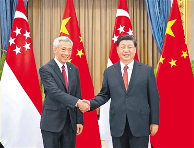 习近平指出,面对世纪疫情和百年变局,中新关系发展势头良好,不仅助力两国抗疫和经济复苏,而且为地区稳定和繁荣注入了正能量。中新关系具有前瞻性、战略性和示范性。中共二十大对中国全面建设社会主义现代化国家、全面推进中国式现代化作出了战略部署。中方愿同新方携手推动两国与时俱进的全方位合作伙伴关系不断取得新进展。