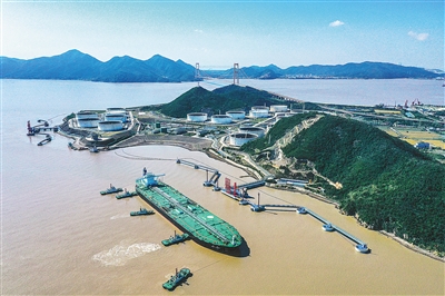 一艘30万吨级油轮在五艘拖轮的护航下靠泊浙江省舟山市册子岛实华原油码头。 |