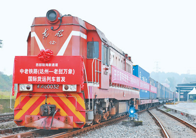 11月16日,在四川达州高新区的瓮福集装箱货场,满载集装箱的列车缓缓驶出,开往老挝万象,标志着西部陆海新通道中老铁路(达州—老挝万象)国际货运列车正式开通。
