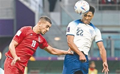 当地时间11月21日,英格兰队球员贝林厄姆(右)在比赛中头球攻门。