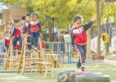 山东省青岛市李沧区金川路幼儿园,小朋友们正在进行户外活动。 张 鹰摄(人民视觉)