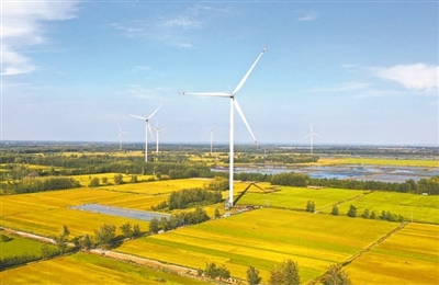 江苏徐州睢宁县积极发展生态绿色农业和清洁风电能源,蓝天白云下大型风力发电设备与稻田相映成趣。 |