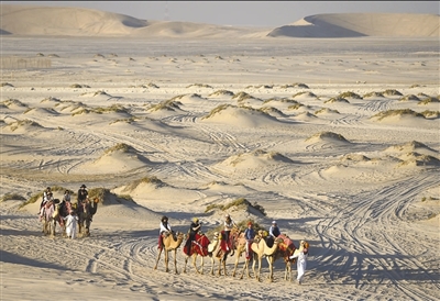 卡塔尔世界杯期间,众多游客选择在球赛间隙离开卡塔尔首都多哈,赴外地游玩。在沙漠中骑骆驼是广受游客欢迎的旅游项目之一。图为11月26日,游客在卡塔尔梅萨伊德的沙漠中骑骆驼游览。