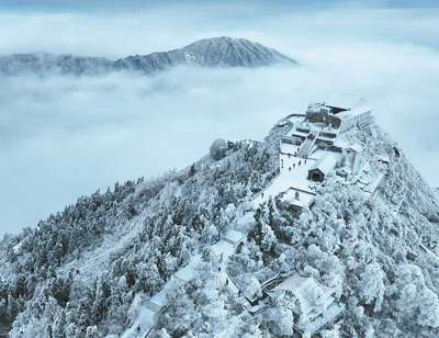 受连日来降温影响,南岳衡山风景区迎来入冬后的第一场雪,银装素裹的山峰在云雾里若隐若现,林木晶莹剔透,呈现出雾凇美景。