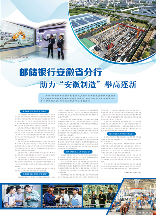 一直以来,邮储银行安徽省分行持续将普惠金融的先天优势转化为支持安徽高质量跨越式发展的服务定势,将做好制造业金融服务作为支持实体经济的重要着力点,不断强化制造业中长期贷款和设备更新改造专项再贷款的投放力度,在推进制造强国战略中践行自己的使命担当。