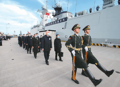 中国人民解放军海军扬州舰伏波静卧,舰上官兵分区列队、肃立舷边。扬州是江泽民同志的故乡。今天,这艘以扬州命名的军舰,以最高礼仪送别这位为党和人民建立了不朽功勋的卓越领导人。江泽民同志的亲属捧护着骨灰登上扬州舰。海军笛吹响,仪仗队持枪肃立,行注目礼。当扬州舰起航时,军港内所有舰船汽笛长鸣,响彻云霄。