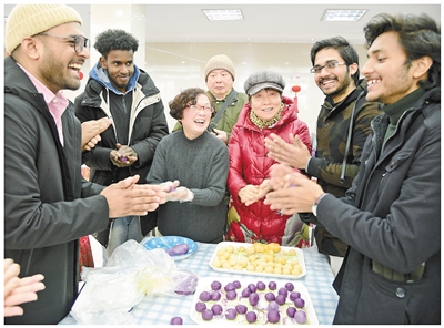 2022年2月11日,来自印度等国的外国留学生在江苏省镇江市二道巷社区和居民一起搓汤圆。 |