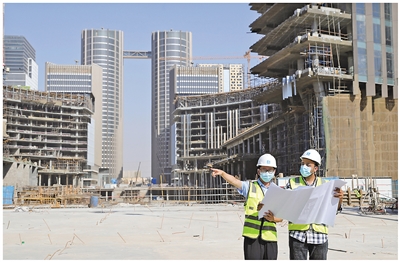 2022年8月17日,中埃两国技术工程师在由中企承建的埃及新行政首都中央商务区项目现场工作。 |