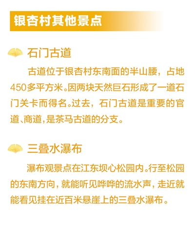 银杏村每年的最佳游览时间是10月末至12月,此时的银杏叶全部变黄,整个村子被金色包裹,非常适合摄影。除了观赏银杏,村里还有石门古战场、三道门、天生桥等古迹可以游览参观。