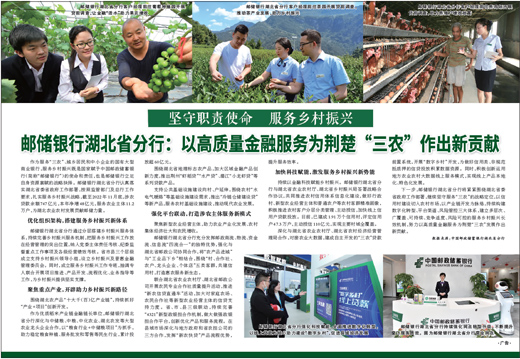 作为服务“三农”、城乡居民和中小企业的国有大型商业银行,服务乡村振兴既是国家赋予中国邮政储蓄银行(简称“邮储银行”)的使命和责任,也是邮储银行立足自身资源禀赋的战略抉择。邮储银行湖北省分行认真落实湖北省委省政府工作部署,按照监管部门及总行工作要求,扎实服务乡村振兴战略,截至2022年11月底,涉农贷款余额747亿元,本年净增48亿元,服务农业主体11.2万户,为湖北农业农村发展贡献邮储力量。