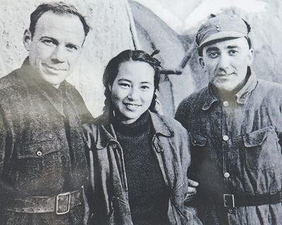 抗战时期,马海德(右)及夫人苏菲与苏联医生阿洛夫(左)在延安窑洞前合影。 |