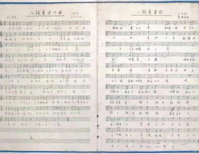 1939年4月,父亲找到了好友公木叔叔,提议共同酝酿一部大合唱,以讴歌人民子弟兵。父亲希望,这部大合唱要写出八路军的精神头:骑兵要写出嗒嗒前进的马蹄声,炮兵要写出隆隆震天的气势,进行曲要长短相间、韵律和谐……公木带着激情提笔,很快就完成了8首合唱歌词的创作。而那时候的音乐创作不比现在,没有钢琴,甚至连手风琴都没有,父亲只能低唱浅吟,边哼哼边打节拍,有时就找块石头敲打硬物来找节奏,有时还会跑出窑洞爬上山坡寻找灵感。8月底9月初,《八路军大合唱》全部编曲完成。父亲在曲谱的卷首亲笔题了八个大字:献给英雄的八路军。