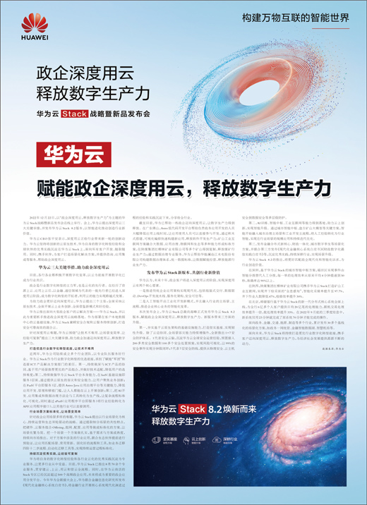 2022年12月22日,以“政企深度用云,释放数字生产力”为主题的华为云Stack战略暨新品发布会在线上举行。会上,华为云提出深度用云三大关键举措,并发布华为云Stack 8.2版本,以智能进化推动创造行业新价值。
