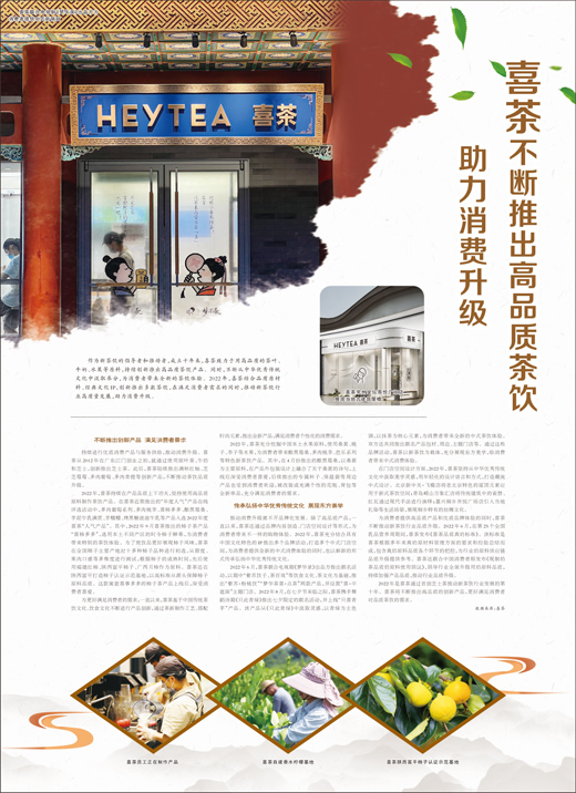 为消费者提供高品质产品和优质品牌体验的同时,喜茶不断推动新茶饮行业品质升级。2022年6月,在第25个全国乳品营养周期间,喜茶发布《喜茶品质真奶标准》。该标准是喜茶根据多年来真奶原材料管理方面的要求和经验总结而成,包含真奶原料品质各个环节的把控,为行业奶原料供应链品质升级提供参考。喜茶还联合中国消费者报发布《现制奶茶品质奶原料使用倡议》,倡导行业全面升级用奶原料品质,持续加强产品品质,推动行业品质升级。