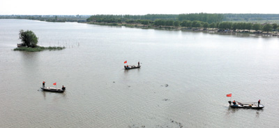 岔河镇管护员们在湖中打捞漂浮物。 |