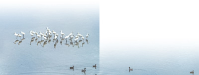 风景如画的天目湖上,成群白鹭和野鸭在觅食、休憩。 |