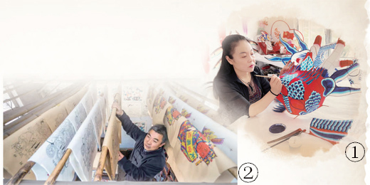 图①:杨红卫正在扎制潍坊龙头蜈蚣风筝。 |