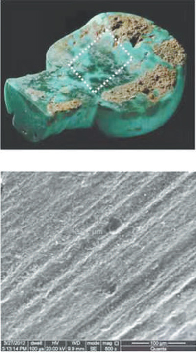 二里头的绿松石微痕研究,放大后显示的磨痕。 |