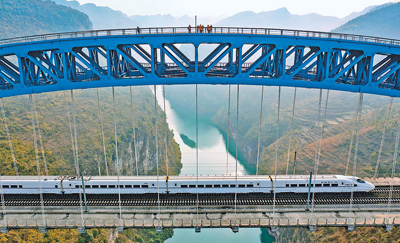 成贵高铁鸭池河特大桥横跨贵州省黔西市的鸭池河,在地势险峻的峡谷间,每天有100多组春运动车经过。在最高处距离河面约277米的大桥上,铁路职工坚守岗位,严格巡检,对大桥的钢结构、供电设备、桥梁支座、外包混凝土等进行细致检查,根据列车运行情况调整轨道线路的几何尺寸、进行钢轨探伤等作业,全力保障春运期间动车组安全通过。