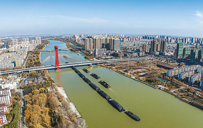 春节临近,各类重点生产生活物资运输需求有较大增长。图为1月10日,京杭大运河江苏宿迁宿豫段,运输粮食、煤炭等物资的货船穿梭有序。