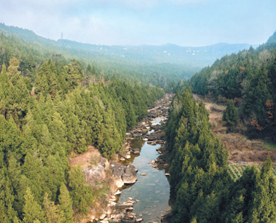 我们沿河水逆流而上,只见清澈的水从石头缝里挤出来,像孩子们笑着唱着,跳跃奔涌。卧在水里、躺在河面的石头,大的或如兵士列阵,或静卧成虎、成牛,小的则依偎在大的身边。石头上还长着绿绿的石菖蒲、牛毛草、鹿角苔,石龙芮开着淡淡的小黄花。河两岸树木林立,藤蔓从树梢垂下,在风中轻摇轻晃。