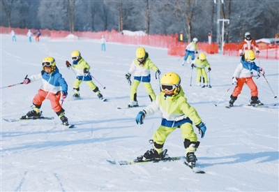 图为吉林长白山鲁能胜地度假区,小朋友在体验滑雪。 |